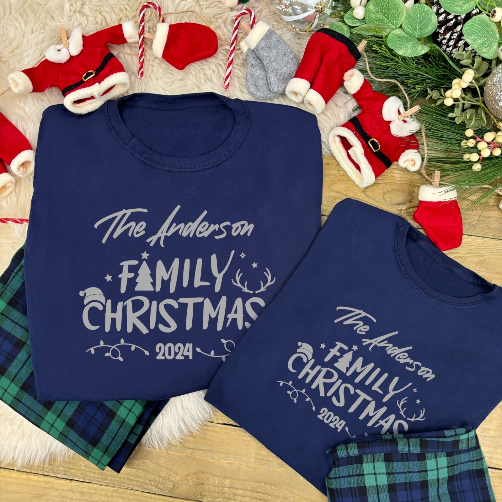 Each pyjama set includes a pair of pyjama trousers and a t-shirt printed with The (INSERT NAME) Family Christmas, a date of your choice and surrounding Christmas-themed graphics, as shown in the images.