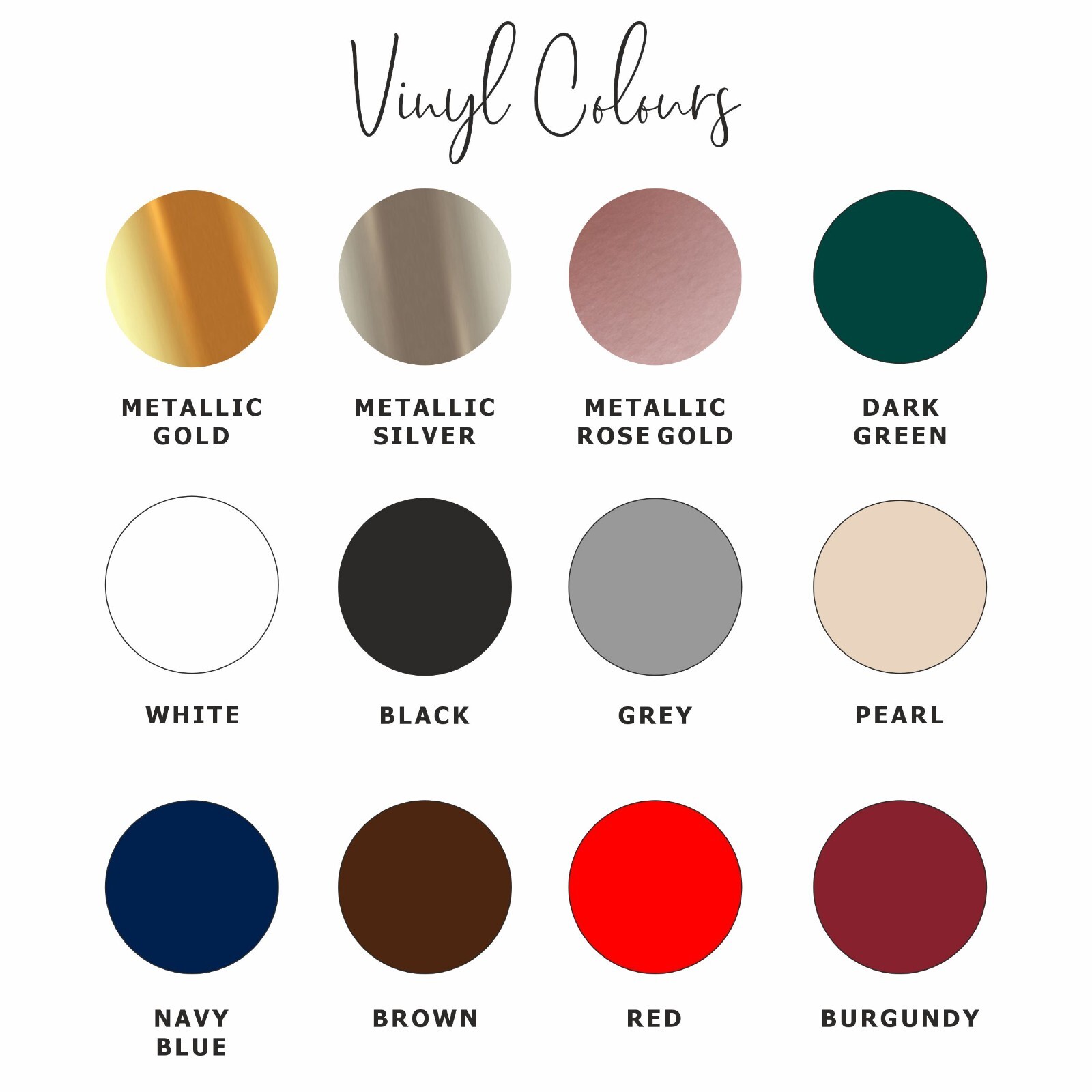 Print Colours: Metallic Gold | Metallic Silver | Metallic Rose Gold | Dark Green | White | Black | Grey | Pearl | Navy Blue | Brown | Red | Burgundy